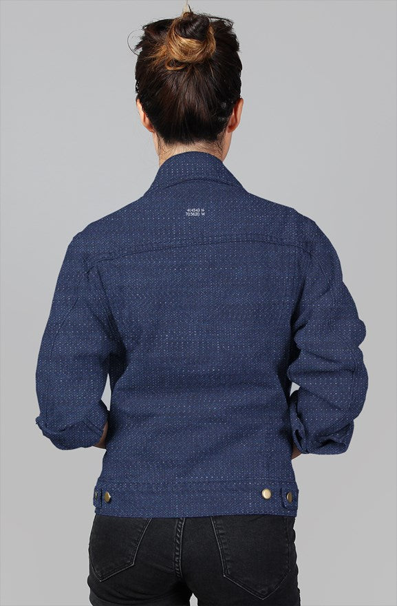 Denim jacket with delta flag on left sleeve and coordinates at rear collar